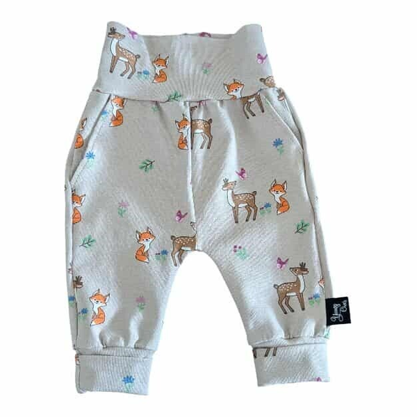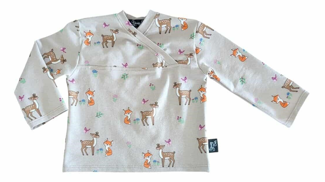 Dit schattige handgemaakte babysetje bestaat uit een comfortabel overslagshirt én een bijpassend broekje, beide met een vrolijke print van vosjes, hertjes, bloemetjes en vlinders. Het perfecte setje voor de allerkleinsten zacht, praktisch en ontzettend lief!